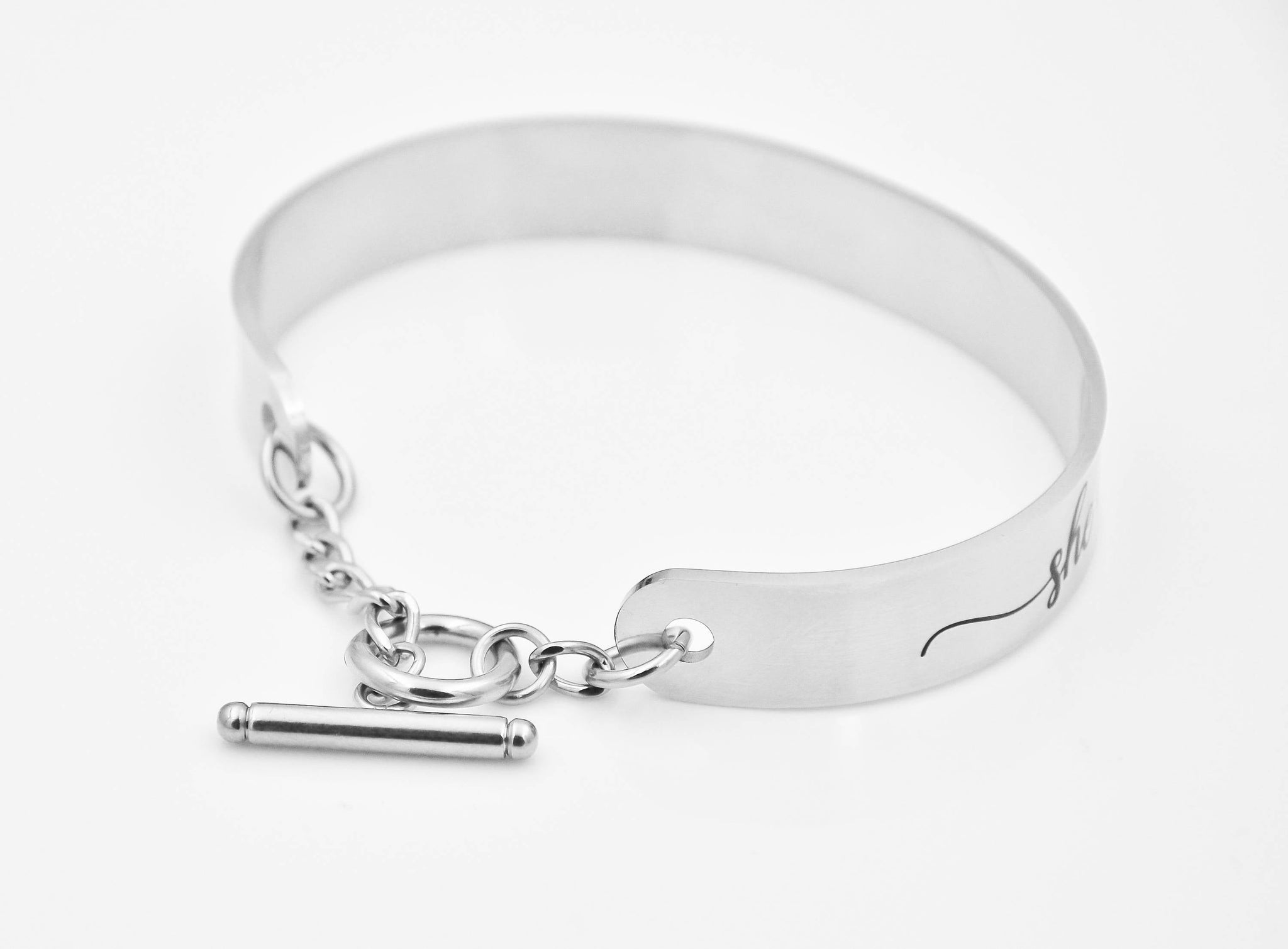 Stainless steel adjustable cuff bracelet is marked with “She believed she could so she did" and comes with a cute toggle closure.